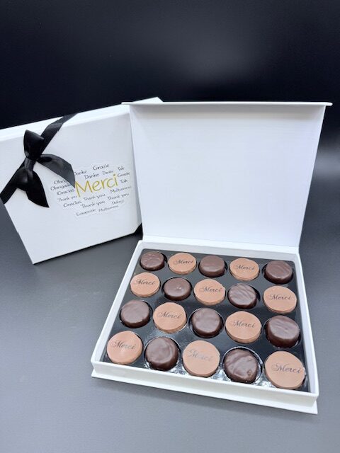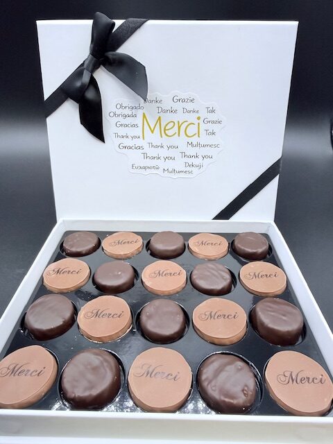 La boîte « Merci » de 20 pralinés aux amandes et noisettes.